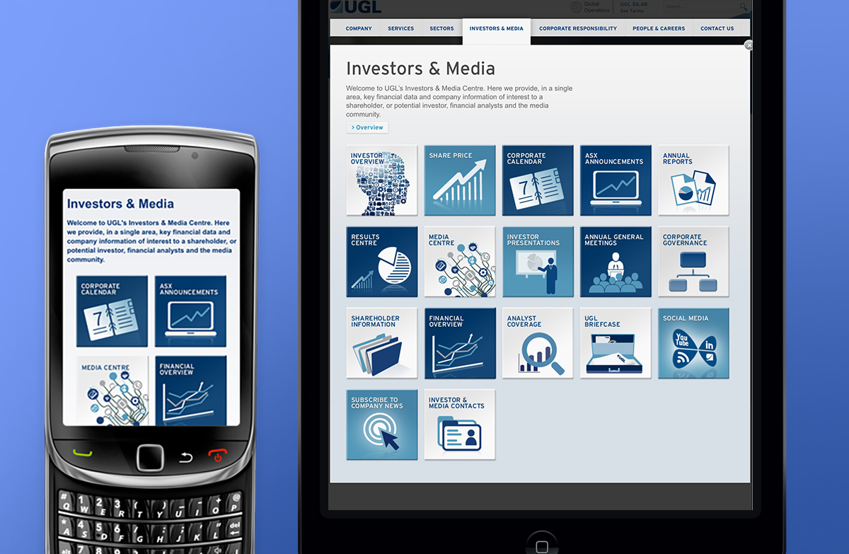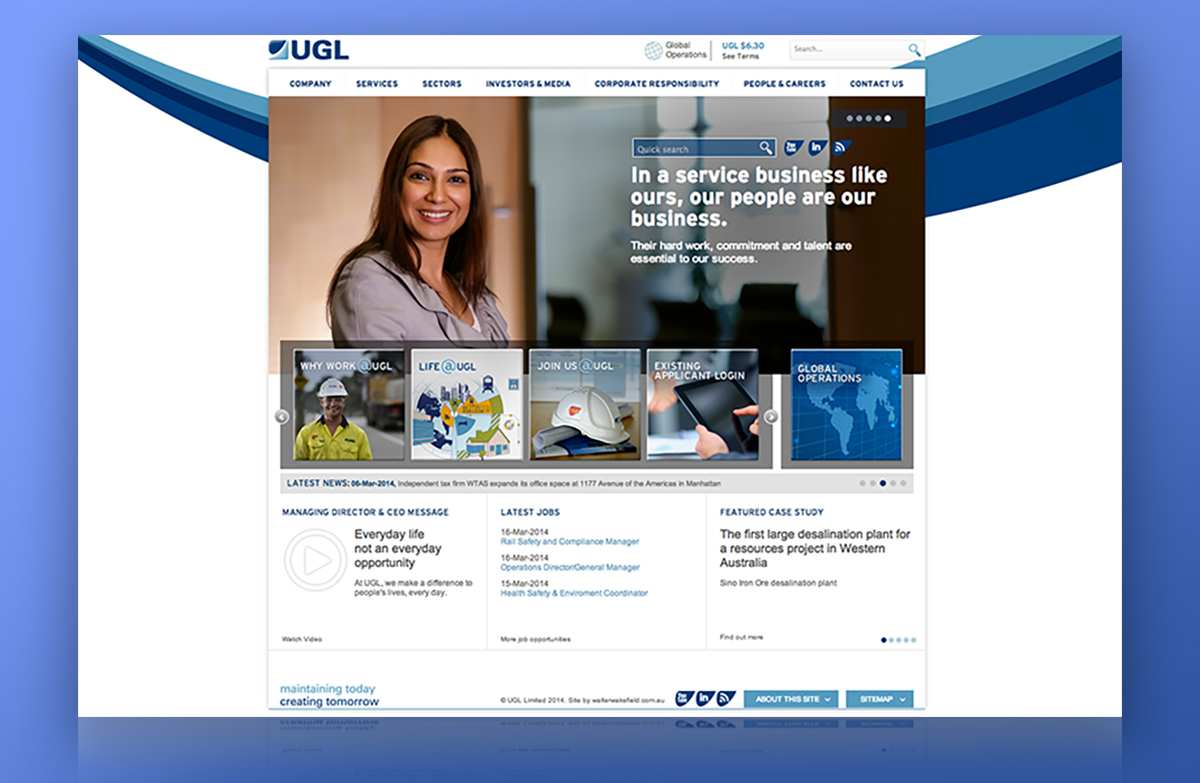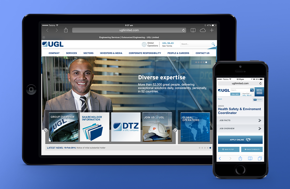 To fulfil its role as the core of their new brand expression, we developed the UGL website with you in mind. Shareholders, clients, employees, partners and casual observers are able to gain easy access to UGL’s expertise. The website is customised for mobile, tablet and desktop. Each platform is tailored specifically for that deployment, based on research and user profiling.
