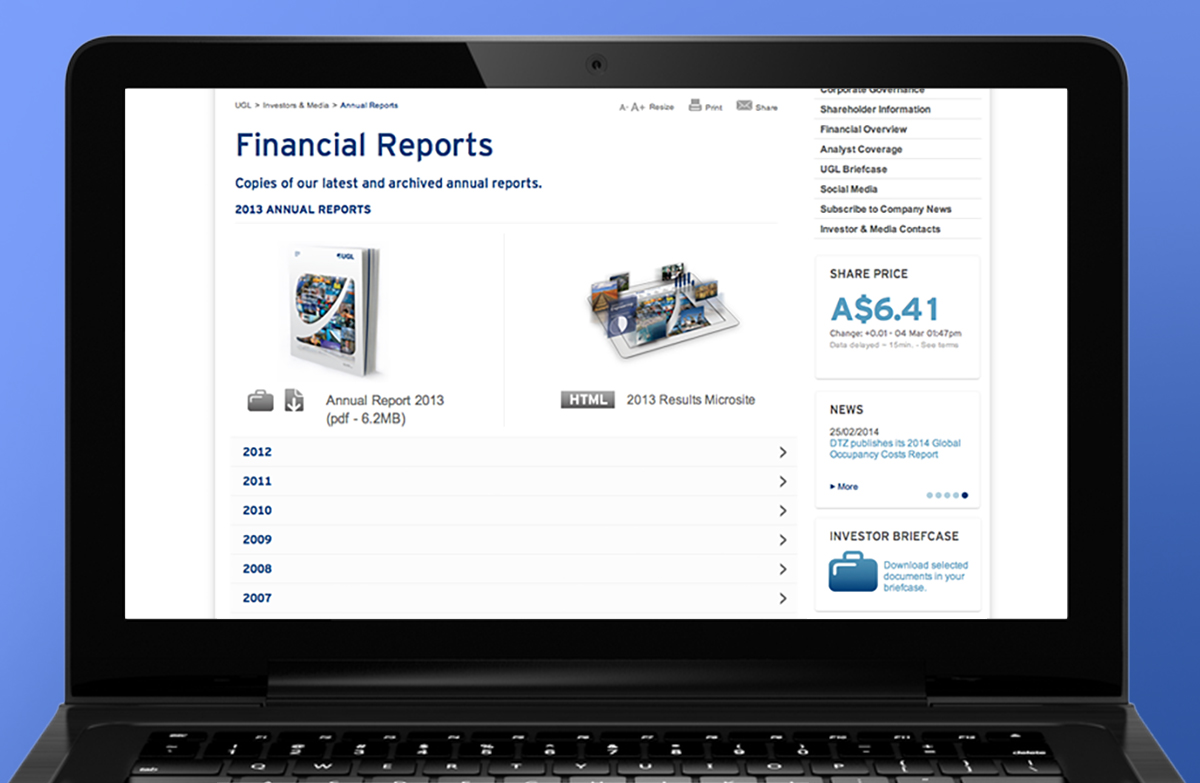 Within a single area of the UGL website you can find key financial data and company information of interest as a shareholder, a potential investor, a financial analyst or a member of the media community. Live share price charts and stock price feeds are a feature. Our in-built Investor Briefcase allows you to collect, zip, share and download files.