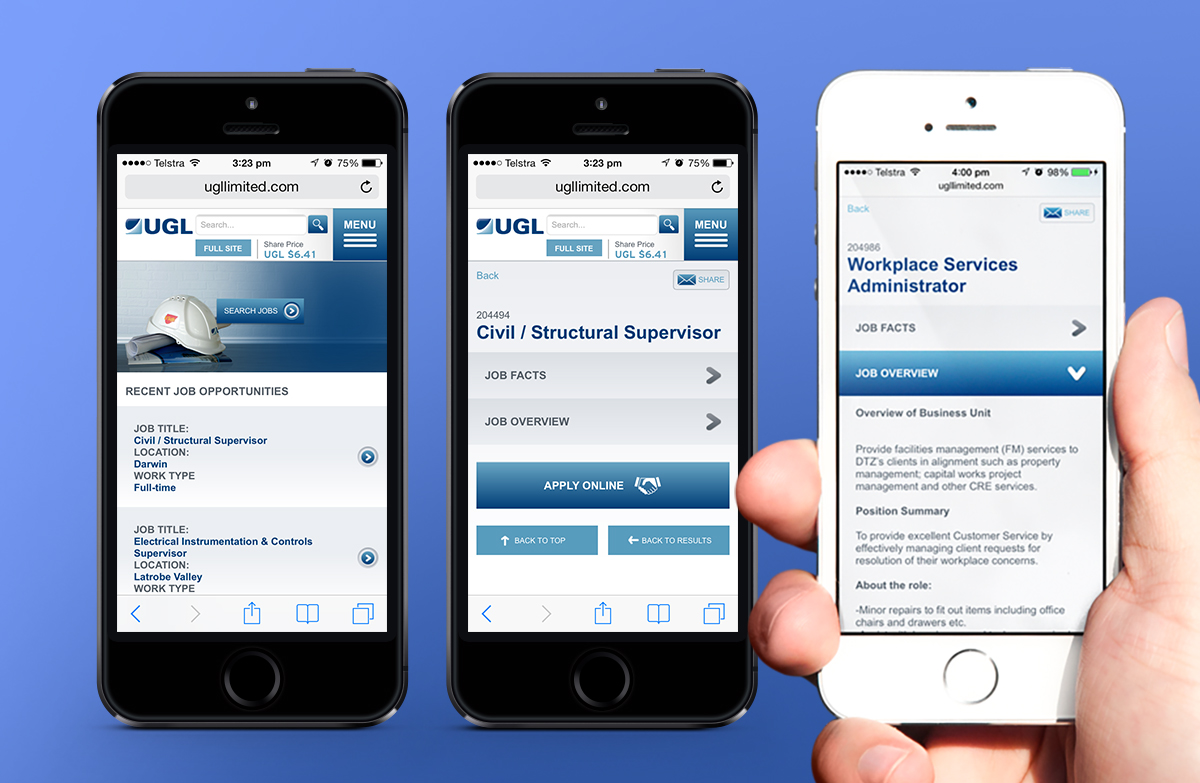 Look to the ‘People & Careers’ section to understand the vision and values of UGL and the opportunities which await you. The website used a Taleo recruitment tool to dynamically pull job opportunity post data in real time. This unique integration allowed us to control the UGL branding and track user behaviour. When viewing the People & Careers portal on a mobile device, the experience is designed for that particular view port. The job search process and job listings are displayed optimised for smaller screens of mobile devices.