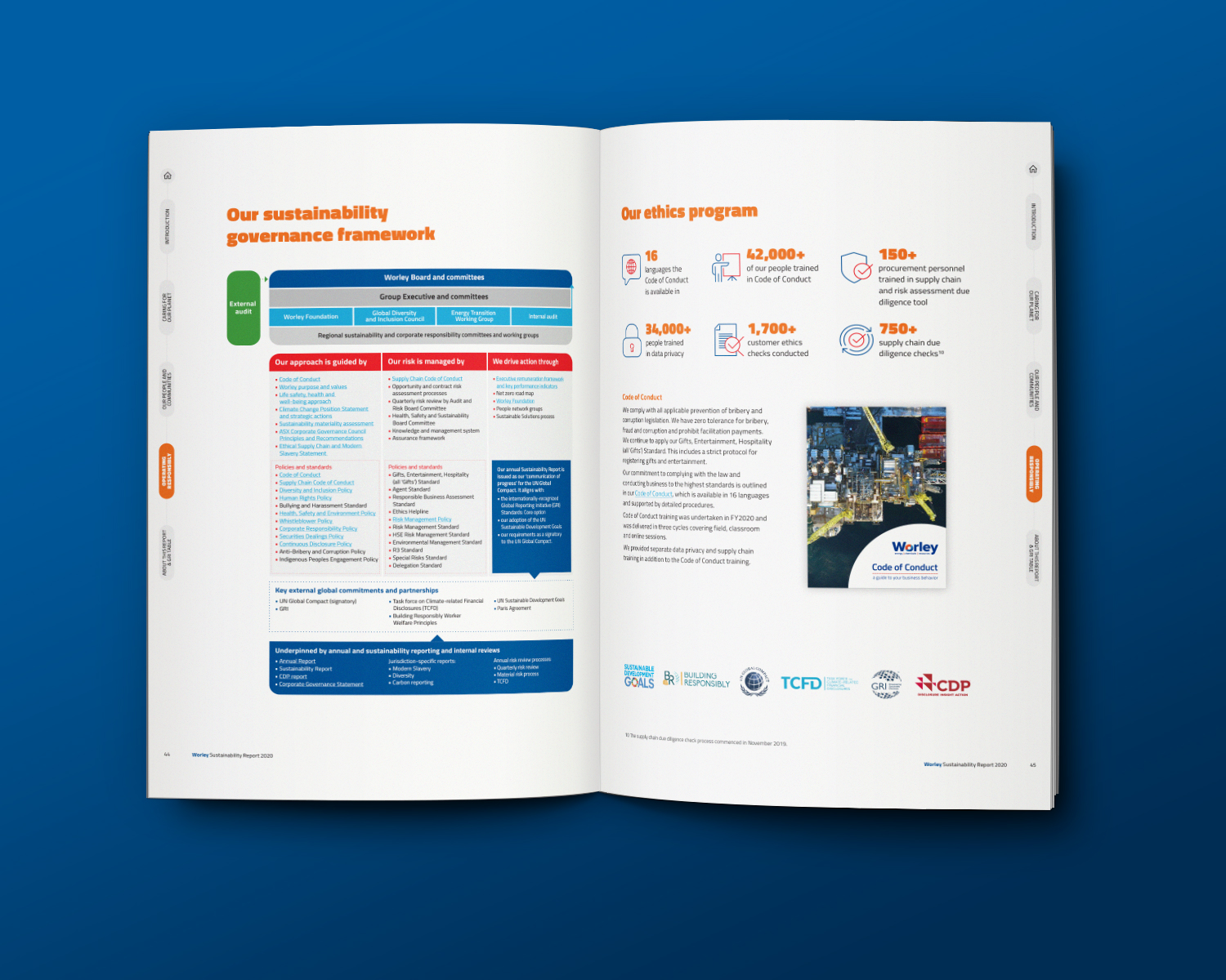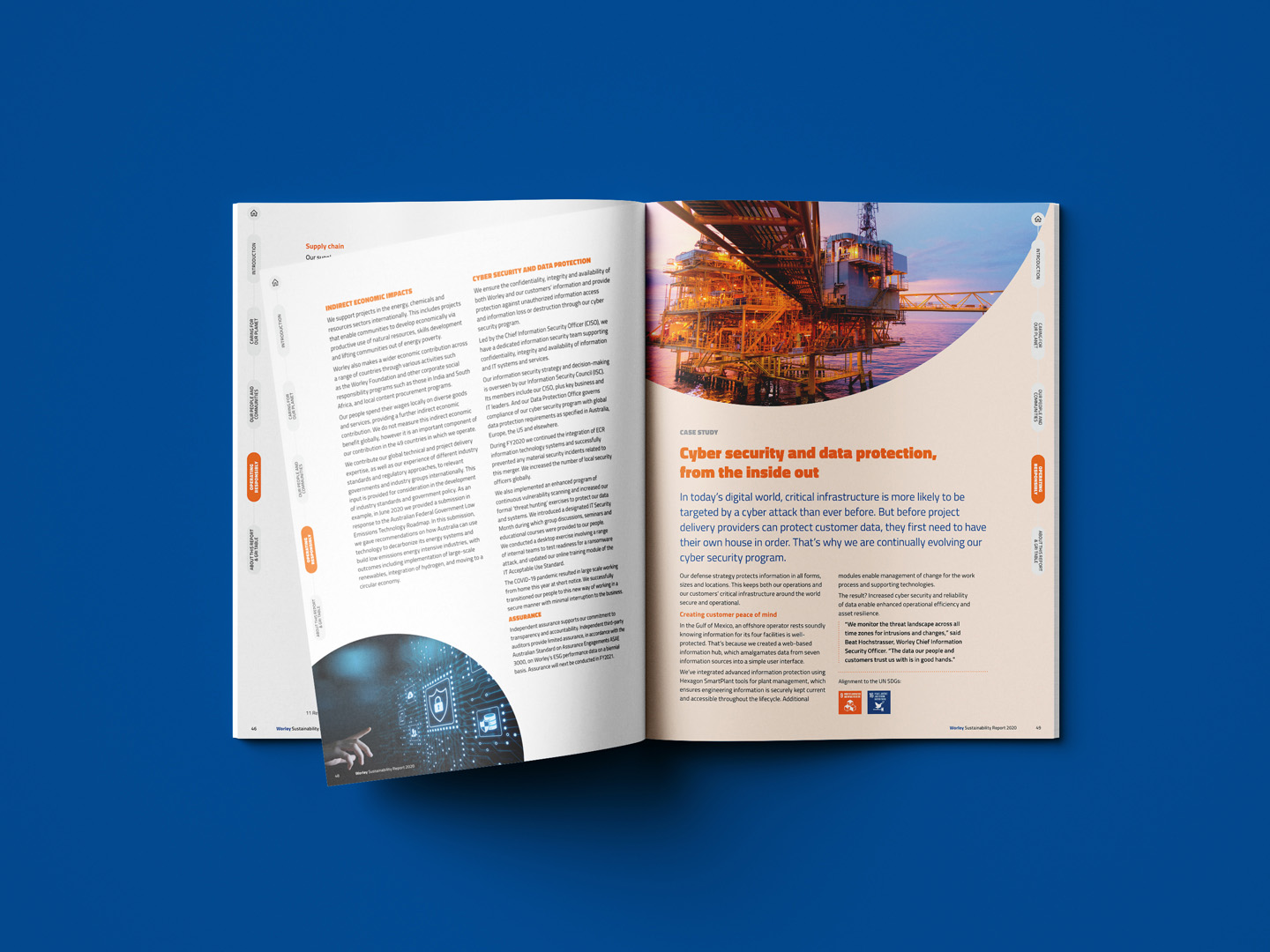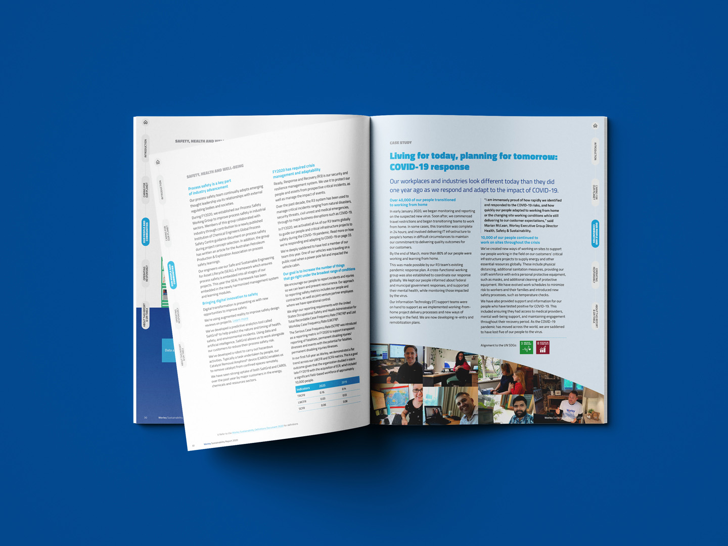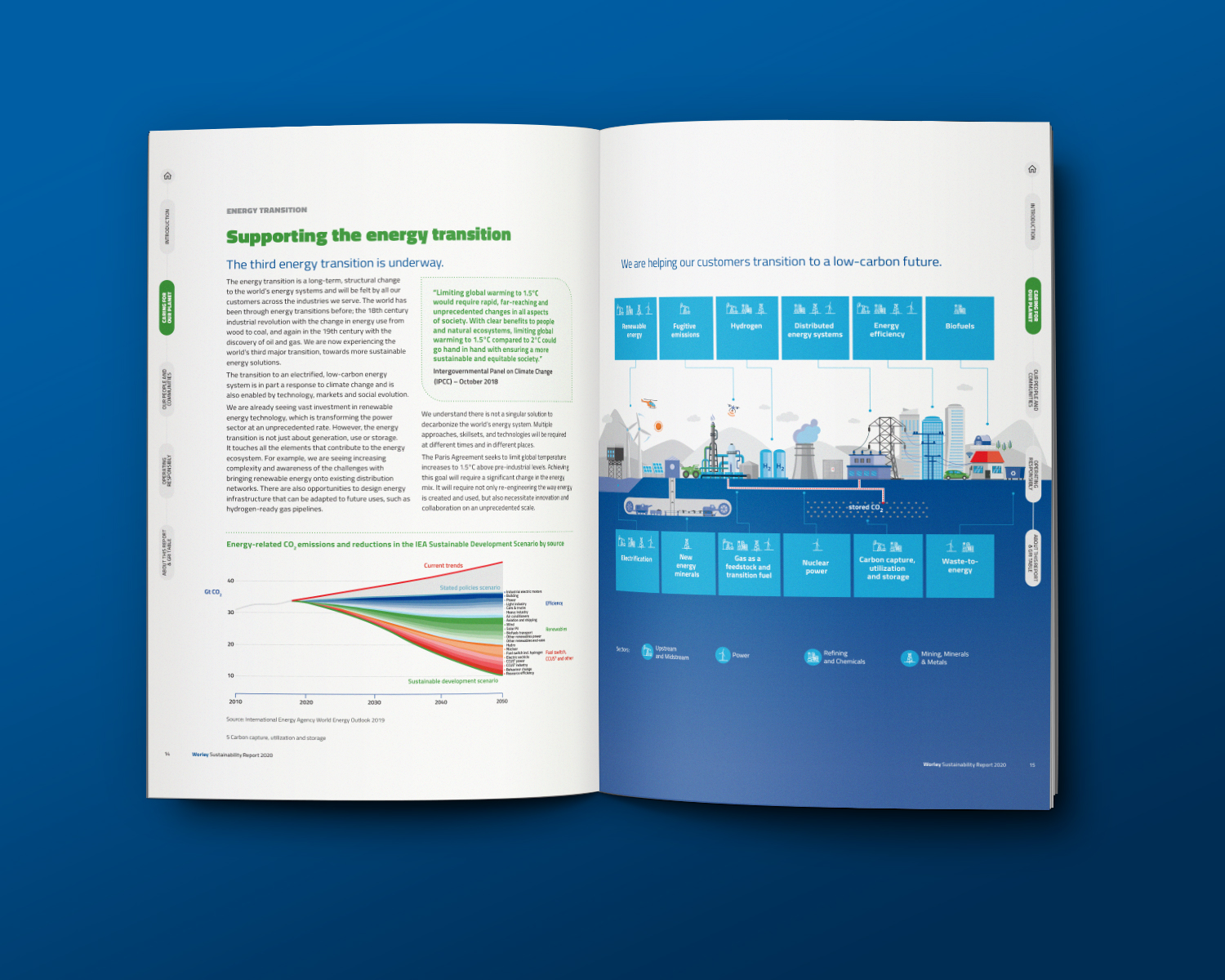 The design of Worley’s sustainability report required a strong differentiation from their competitors in order to best communication their leading position in the energy transition and how sustainability is core to what they do.