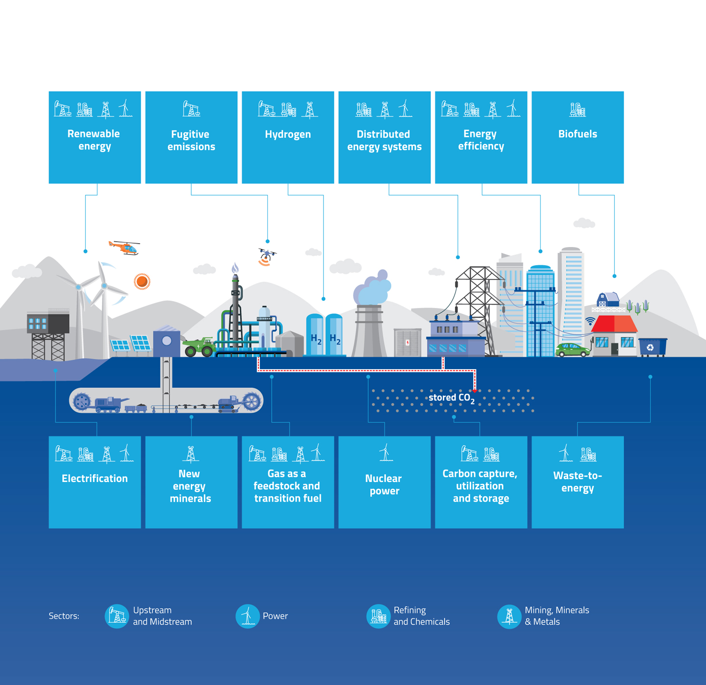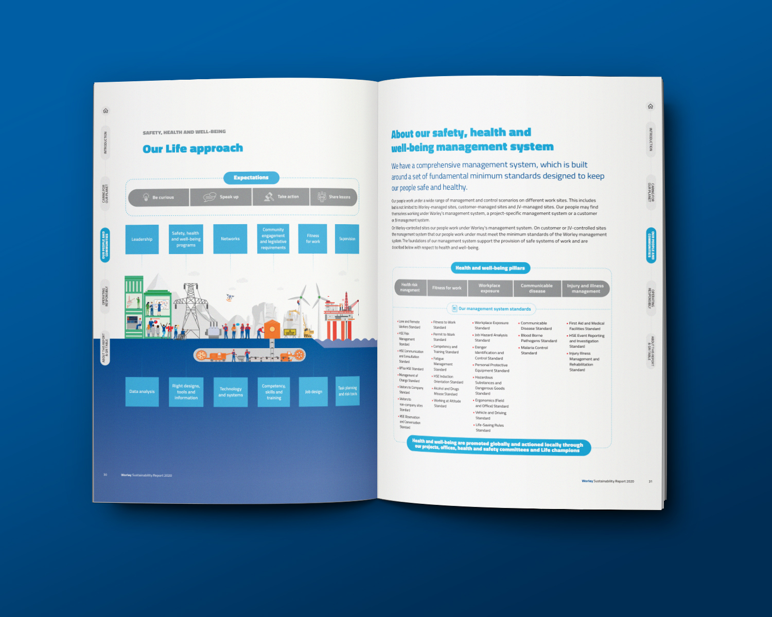 A series of infographics were developed in order to help readers navigate and more quickly engage with content. These included Worley’s value chain, Worley’s position in the energy transition, and Worley’s Life approach to safety, health and well-being.