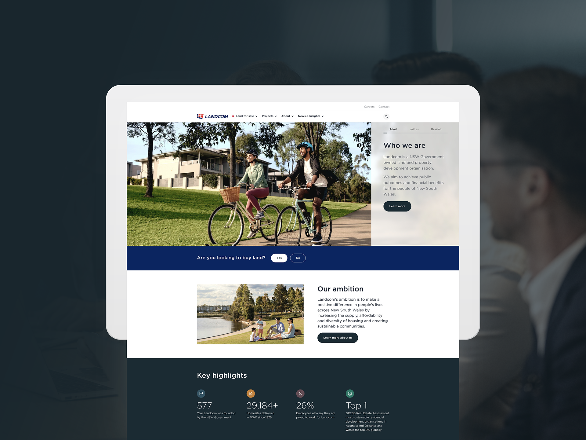 ww directed multiple photography and video shoots to equip Landcom with an up-to-date image library for the website and beyond. It was important to adequately capture what Landcom does: developing master-planned communities. We did this by showcasing their people doing what they do best in developing projects, existing projects and in their offices. We were also pleased to photograph new homeowners delighted with their new purchase.