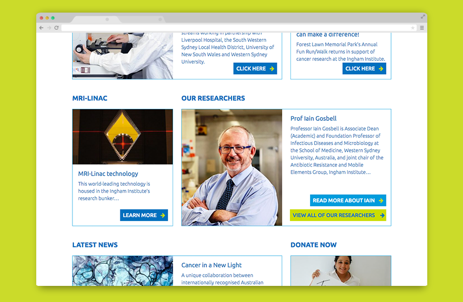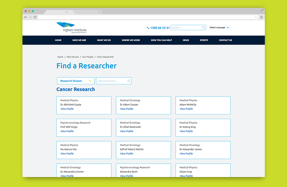 A database of hundreds of researchers’ profiles, their contact details and publications now have a single source but many outputs. The data is pushed from the CRM to WordPress, producing a branded and styled profile page for each researcher, bringing them under the Ingham umbrella. Furthermore, the researchers are empowered by having their own sub-domain created automatically, as soon as their profile is entered into the Dynamics 365 CRM. A strategic move by the institute to entice and engage the researchers while giving them a powerful tool they can own.