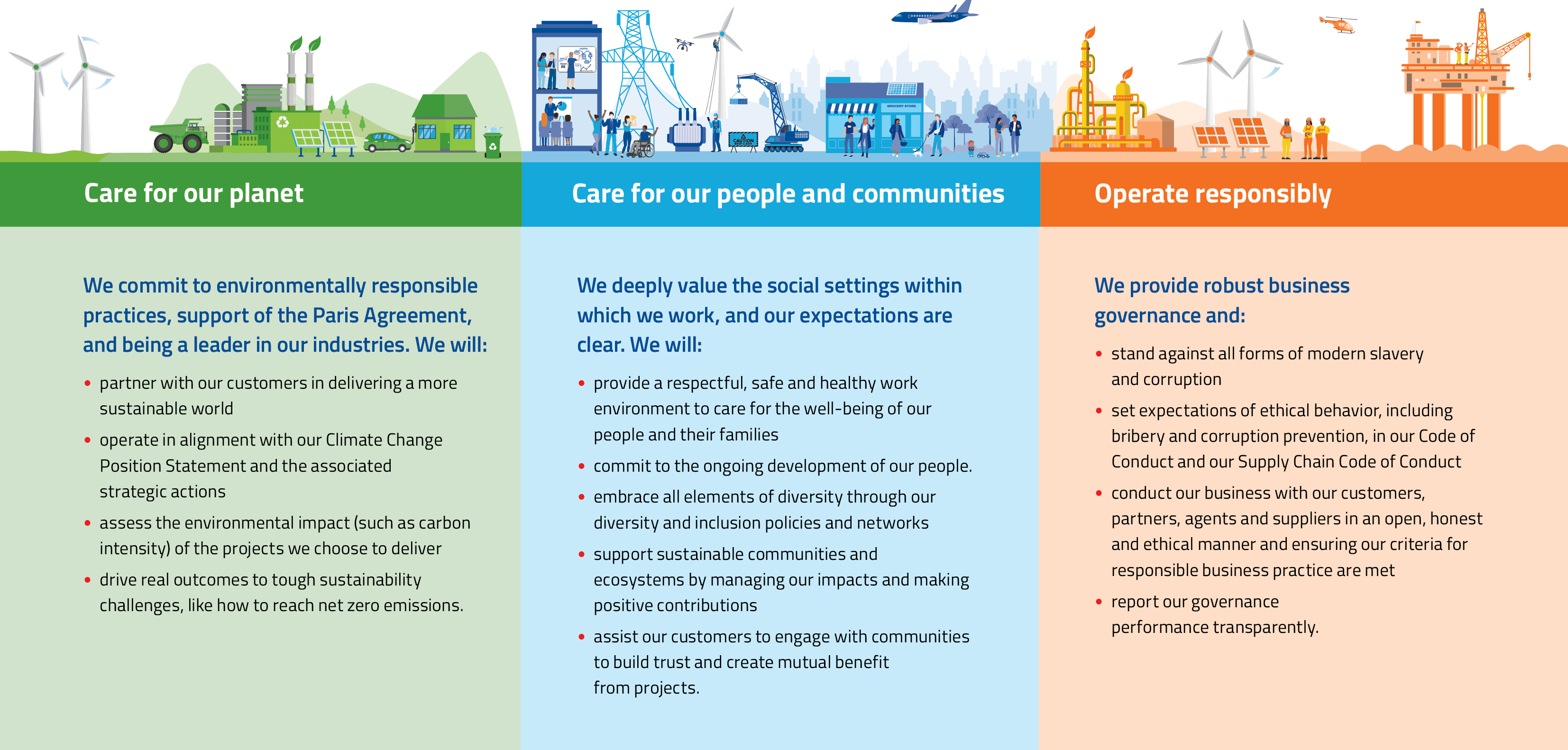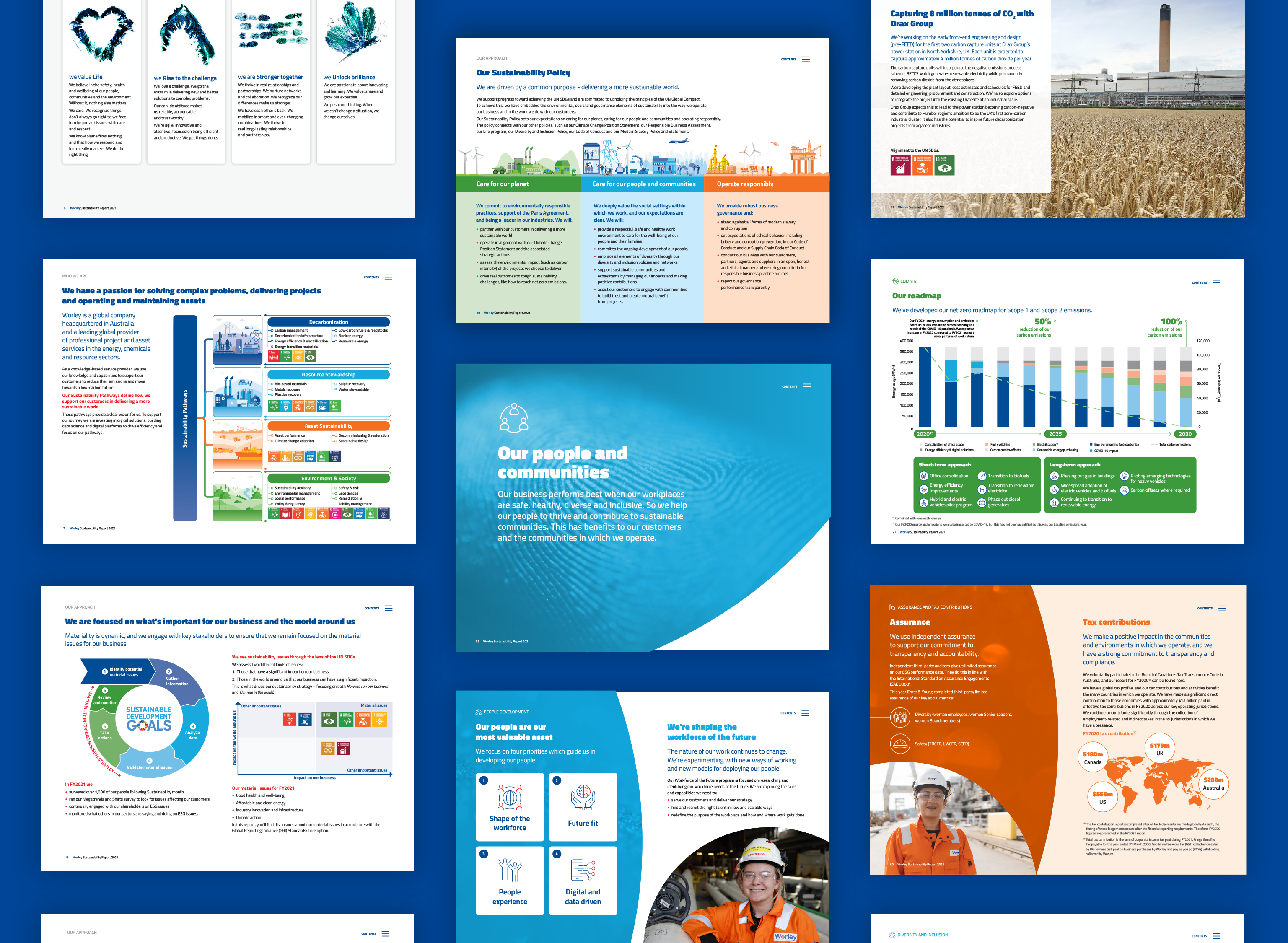 After working with Worley in 2020 to produce their first Sustainability Report, we assisted with further enhancing and visually communicating Worley’s leading position in the energy transition in their 2021 Sustainability Report. With a digital-first approach, we adjusted the format to a landscape document for better online viewing, given no printed copies were to be produced. This report introduced their sustainability pathways, which focuses on Decarbonization, Resource Stewardship, Asset Sustainability and Environment & Society, and aids Worley in leading the way to accelerate sustainable development.
